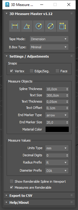 The Export to CSV rollout lets you manage all measurements in your scene through a clear, organized table and export their values for external use or documentation.