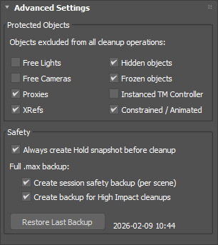 The Advanced Settings rollout defines which objects are excluded from cleanup operations, and how scene safety is handled before any destructive action is performed.