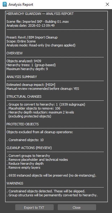 Instead of blindly modifying the scene, the tool analyzes the hierarchy first, clearly reporting what will be changed, what will be preserved, and how risky the cleanup will be — before any action is applied.