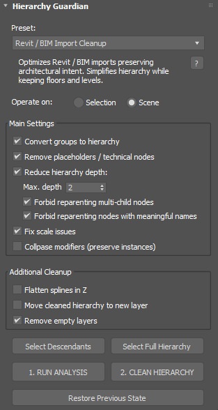 The goal is not aggressive flattening, but predictable, controlled hierarchy normalization, suitable for real production environments and professional ArchViz pipelines.