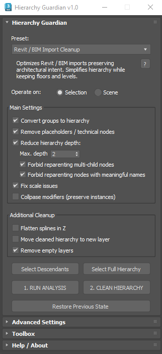 Hierarchy Guardian is a professional hierarchy analysis and cleanup tool for Autodesk 3ds Max, designed to safely simplify complex scene hierarchies without compromising production stability.